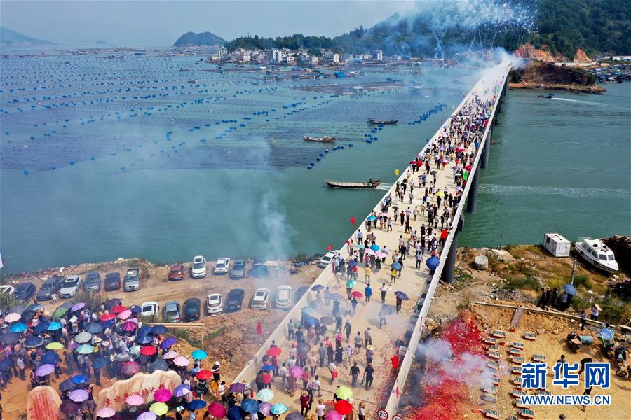 10月12日,福建省霞浦縣東安島海防大橋正式通車,這是當(dāng)?shù)厝罕娮咴谛聵蛏希o人機(jī)拍攝)。新華社記者姜克紅攝