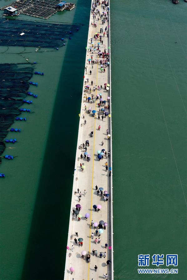10月12日,福建省霞浦縣東安島海防大橋正式通車,這是當(dāng)?shù)厝罕娮咴谛聵蛏希o(wú)人機(jī)拍攝)。新華社記者姜克紅攝