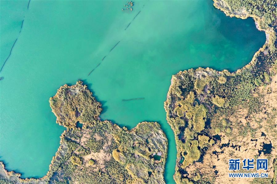 這是新疆博斯騰湖濕地一景(10月12日無人機拍攝)。入秋以來,新疆博斯騰湖碧波蕩漾,美景如畫,吸引各地游客前來游玩。新華社記者丁磊 攝
