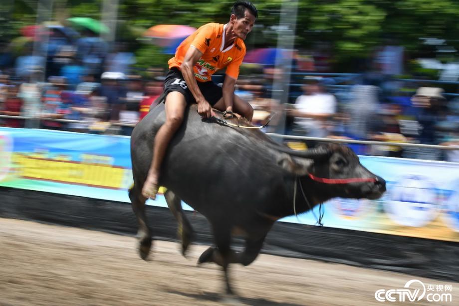 當(dāng)?shù)貢r間2019年10月12日,泰國春武里舉行一年一度的水牛賽跑,選手騎??癖?。視覺中國