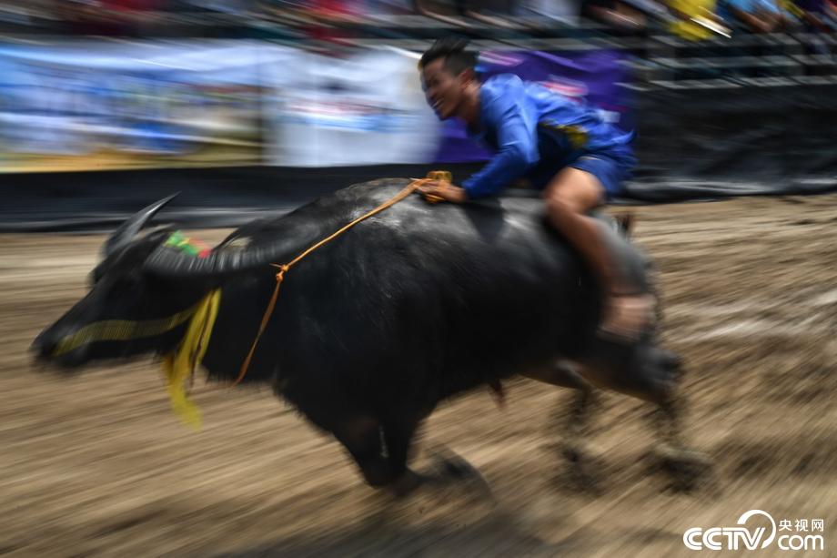 當?shù)貢r間2019年10月12日,泰國春武里舉行一年一度的水牛賽跑,選手騎牛狂奔。視覺中國