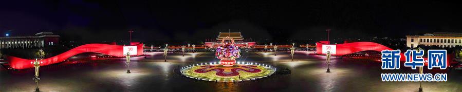 這是10月14日拍攝的天安門廣場中心花壇(全景拼接圖片)。 10月14日,以“花果籃”為主造型的天安門廣場中心花壇吸引了眾多游客參觀拍照?!盎ü@”的夜景更是流光溢彩,絢爛迷人。 新華社記者 殷剛 攝
