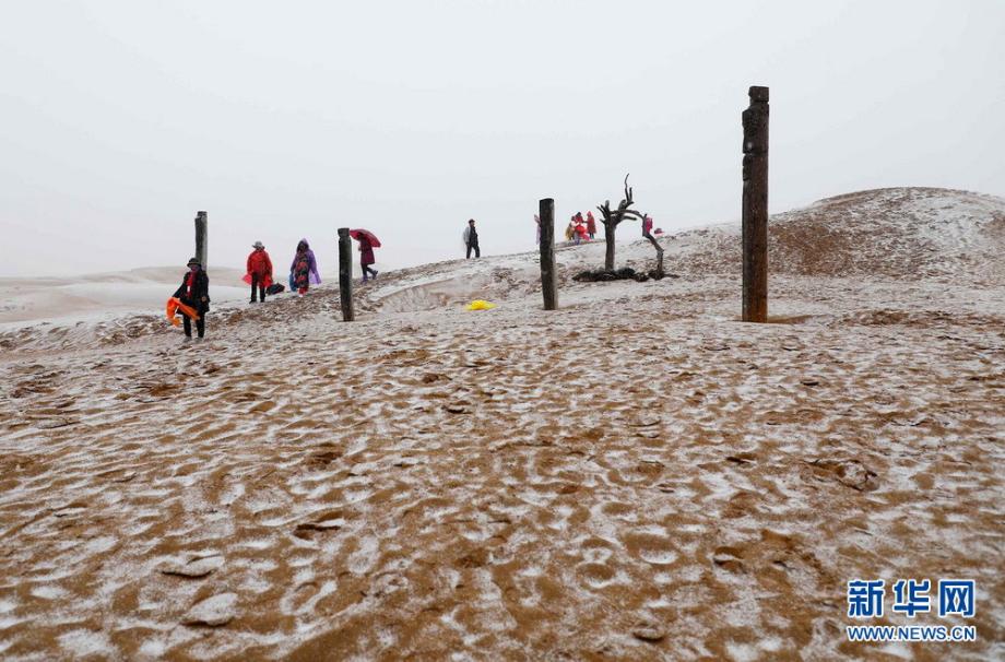 10月15日,游客在寧夏中衛(wèi)市沙坡頭景區(qū)欣賞沙漠雪景。深秋時(shí)節(jié),位于騰格里沙漠邊緣的寧夏中衛(wèi)市沙坡頭景區(qū)迎來一場降雪。漫漫黃沙被覆蓋在皚皚白雪之下,呈現(xiàn)出一種別樣的美。新華網(wǎng)杜文杰攝