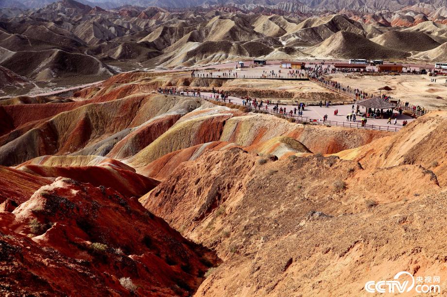 央視網(wǎng)消息:2019年10月15日,金秋時(shí)節(jié),位于甘肅省張掖市臨澤縣的七彩丹霞景區(qū)進(jìn)入旅游旺季,吸引眾多游人紛至沓來(lái)。張掖七彩丹霞景區(qū),分布面積約50公里,是中國(guó)北方干旱地區(qū)發(fā)育最典型的丹霞地貌。在方圓數(shù)十平方公里的范圍內(nèi),隨處可見(jiàn)有紅、黃、橙、綠、白等多種鮮艷的色塊或線條,把一座座山峰,一條條溝壑,裝點(diǎn)成一幅幅絢麗多姿、燦爛奪目的畫(huà)圖。圖片來(lái)源:視覺(jué)中國(guó)