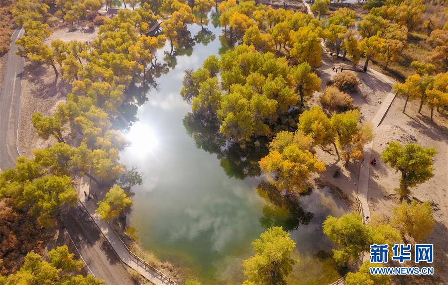 10月16日無人機拍攝的內(nèi)蒙古阿拉善盟額濟納旗境內(nèi)的胡楊林。新華社記者彭源攝