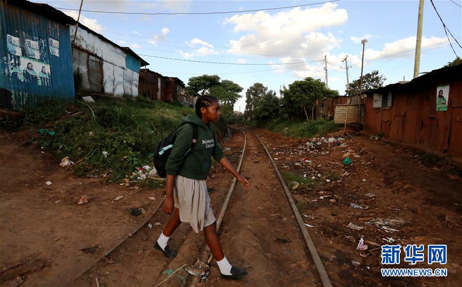 10月16日,在肯尼亞內(nèi)羅畢基貝拉貧民窟,一名學(xué)生走過(guò)鐵軌。新華社記者王騰攝