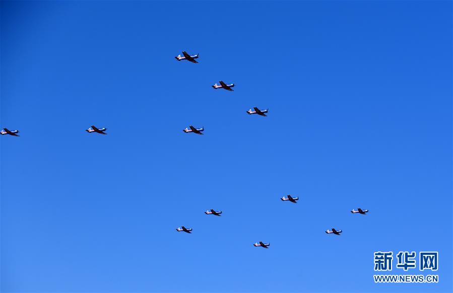 10月17日,“天之翼”飛行表演隊進(jìn)行飛行表演。 當(dāng)日,慶祝人民空軍成立70周年航空開放活動在吉林長春開幕??哲姸嘀эw行表演隊、跳傘表演隊共舞藍(lán)天,殲-20、運(yùn)-20、殲-16等多款主力戰(zhàn)機(jī)展翅蒼穹,空降兵和航空兵作戰(zhàn)部隊派出精銳力量展示作戰(zhàn)對抗,多型武器裝備大規(guī)模、全系統(tǒng)抵臨現(xiàn)場。人民空軍以前所未有的強(qiáng)大陣容亮相長春,頌揚(yáng)中國航空事業(yè)110年發(fā)展成就,以開放、自信的姿態(tài)為即將到來的人民空軍70華誕獻(xiàn)上大禮。 新華社記者 張楠 攝