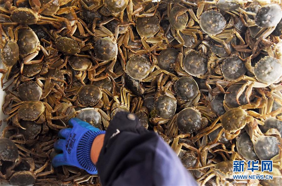 10月17日,東營市惠澤農(nóng)業(yè)科技有限公司黃河口大閘蟹養(yǎng)殖區(qū)的工人在撿拾大閘蟹進(jìn)行稱重。新華社記者 王凱 攝