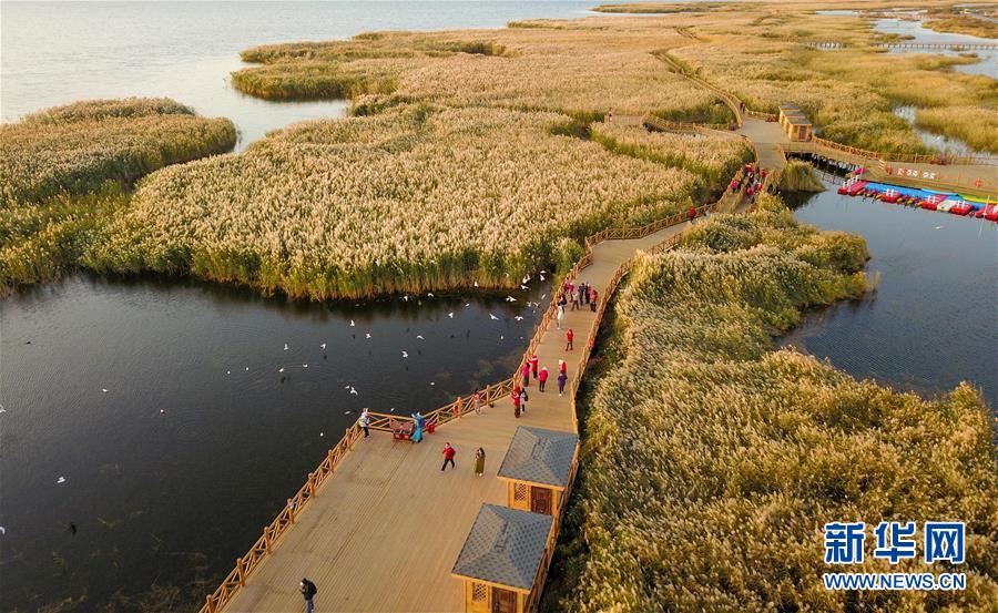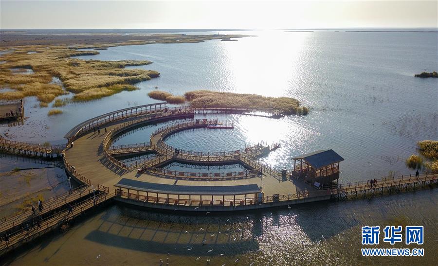 10月17日,游客在居延海岸邊的木棧道上觀(guān)賞水鳥(niǎo)。新華社記者 彭源 攝