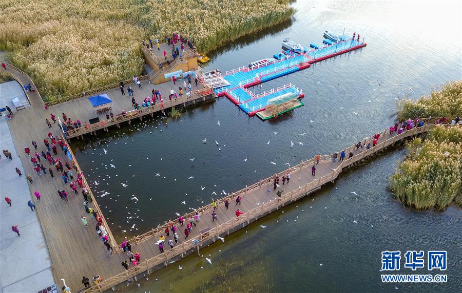 10月17日,游客在居延海岸邊的木棧道上給水鳥(niǎo)喂食。 新華社記者 彭源 攝