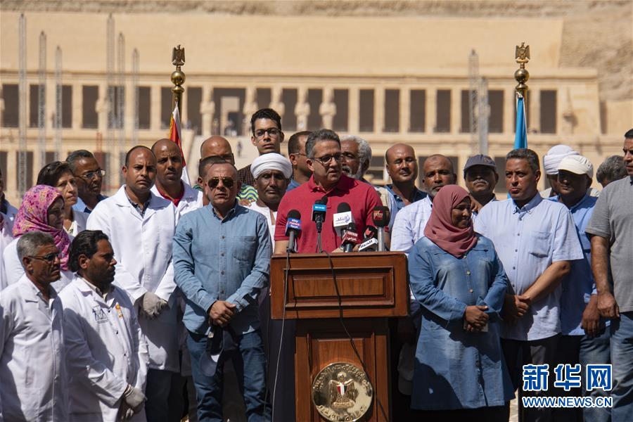 10月19日,在埃及盧克索,埃及文物部長哈立德·阿納尼在新聞發(fā)布會上講話。 埃及文物部19日在南部城市盧克索舉行的新聞發(fā)布會上宣布,埃及考古隊近期發(fā)掘出30具3000年前的木質(zhì)棺槨。 新華社記者 李碧念 攝