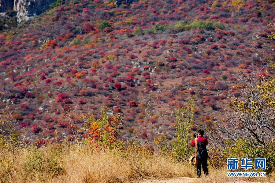 10月24日,游客在河北省武安市賀進(jìn)鎮(zhèn)后臨河村拍攝紅葉。新華社記者王曉攝