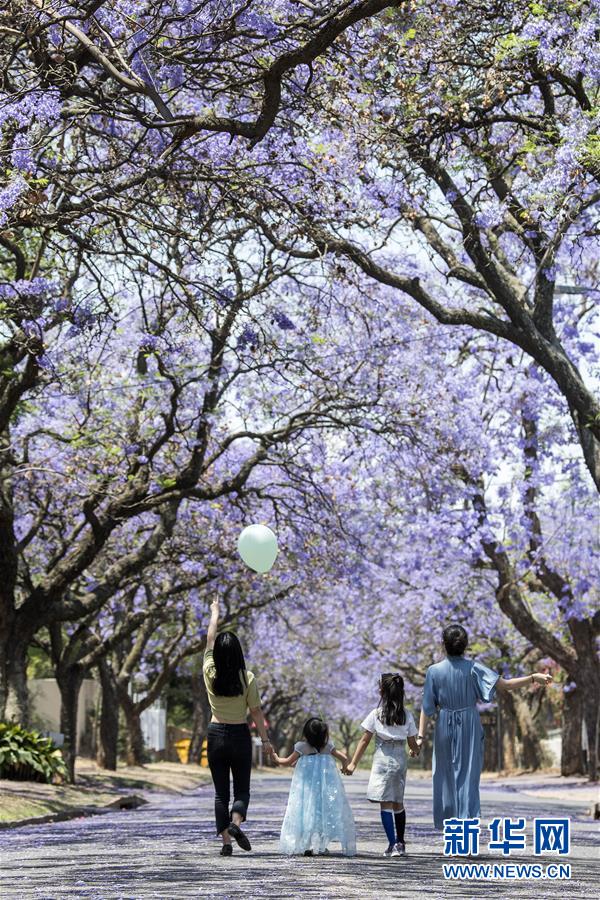 10月20日,在南非比勒陀利亞,游人在藍(lán)花楹樹下賞花。新華社記者陳誠(chéng)攝