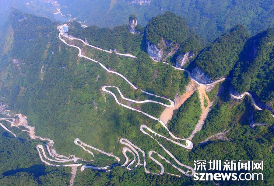 天門山盤山公路位于湖南省張家界市境內(nèi)的國家森林公園天門山上,盤山公路全長10.77公里,海拔從200米急劇提升到1300米,大道兩側(cè)絕壁千仞,空谷幽深,共計(jì)99個(gè)彎,180度急彎此消彼長,似玉帶環(huán)繞,航拍鏡頭下蜿蜒曲折的道路彎彎緊連,層層迭起,宛如迷宮般的“納斯卡線條”,被譽(yù)為“天下第一公路奇觀”,同時(shí)它也是世界上最危險(xiǎn)的十大公路之一。