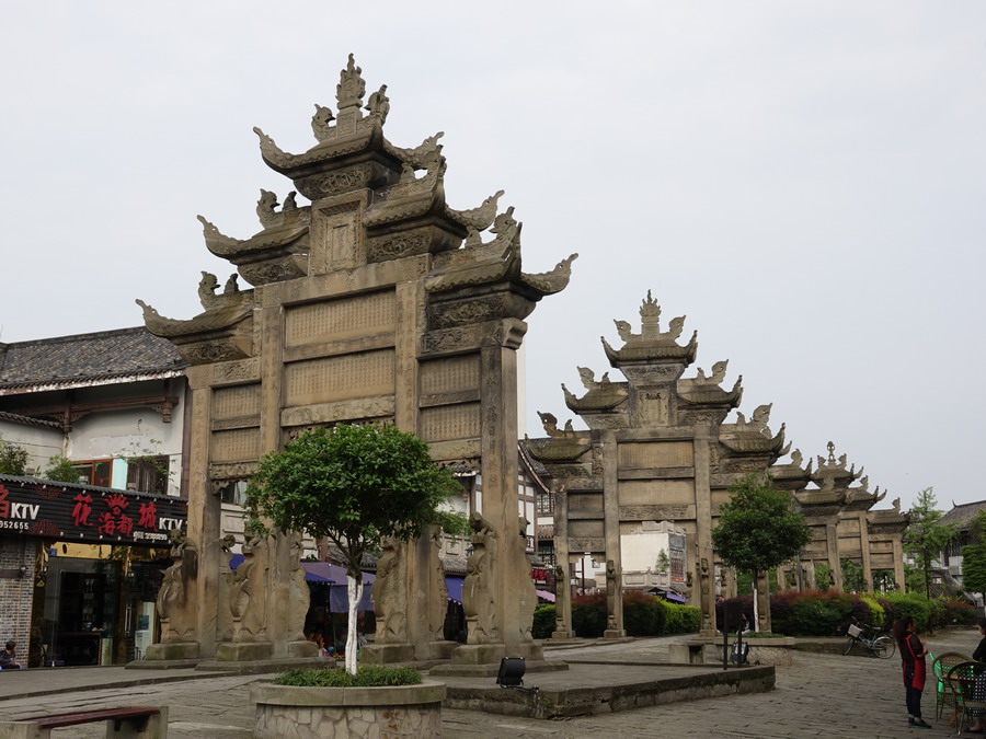 隆昌石牌坊大多為四柱三門三重檐五滴水石質(zhì)牌樓式建筑,平均面寬9米,通高11米,坊間距離最近處僅10余米。李仁奇攝