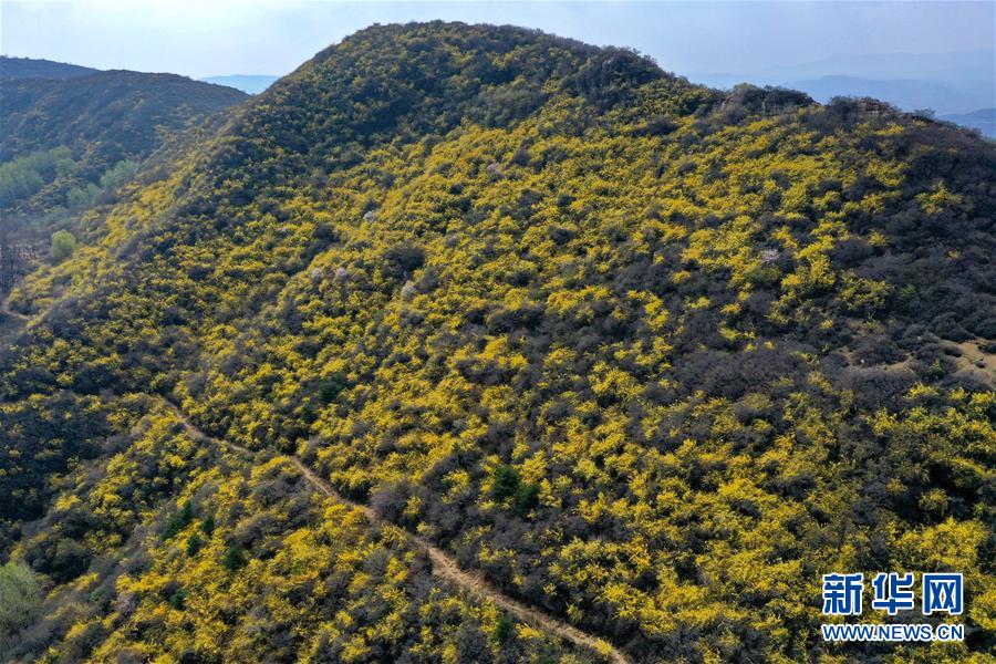山西省平定縣冠山上盛開(kāi)的連翹花(4月10日無(wú)人機(jī)拍攝)。