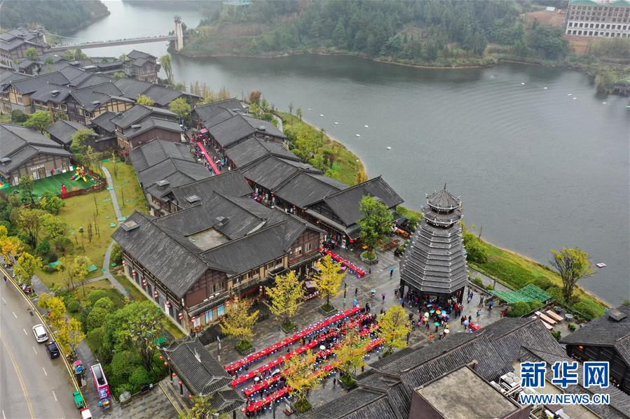丹寨縣萬達(dá)小鎮(zhèn)萬人長桌宴(10月26日無人機(jī)拍攝)。