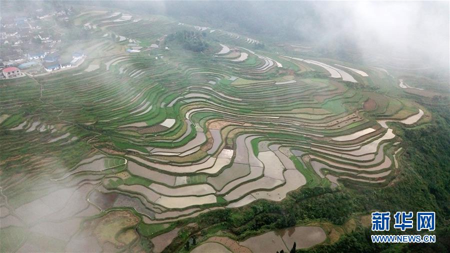這是5月18日無(wú)人機(jī)拍攝的貴州省丹寨縣龍泉鎮(zhèn)高要梯田景色。初夏時(shí)節(jié),位于貴州省丹寨縣龍泉鎮(zhèn)的高要梯田景色優(yōu)美。新華社記者楊文斌攝