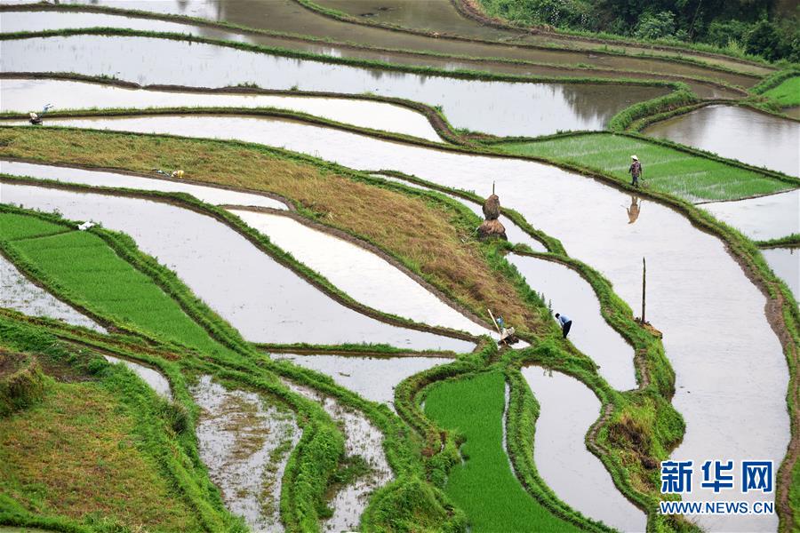 5月18日,農(nóng)民在貴州省丹寨縣龍泉鎮(zhèn)高要梯田里勞作。初夏時(shí)節(jié),位于貴州省丹寨縣龍泉鎮(zhèn)的高要梯田景色優(yōu)美。新華社記者楊文斌攝