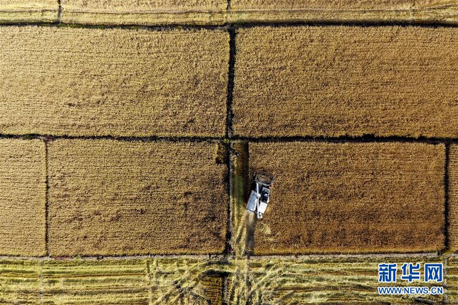 在太原市晉源區(qū)赤橋村,收割機在稻田里作業(yè)(10月28日無人機拍攝)。新華社記者詹彥攝