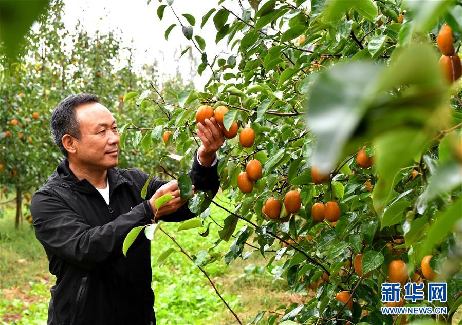 種植戶李應賢在河南省洛寧縣馬店鎮(zhèn)關(guān)廟村查看金珠沙梨生長情況(10月9日攝)。新華社記者李嘉南攝