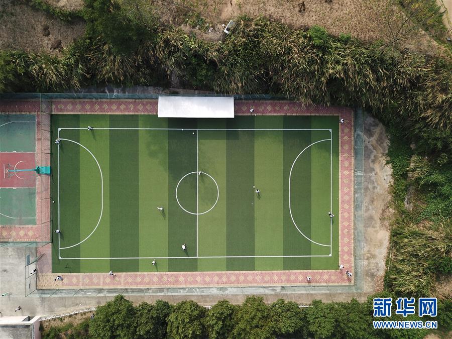 金寨縣希望小學(xué)學(xué)生在上足球課(9月3日無(wú)人機(jī)拍攝)。新華社記者劉軍喜攝