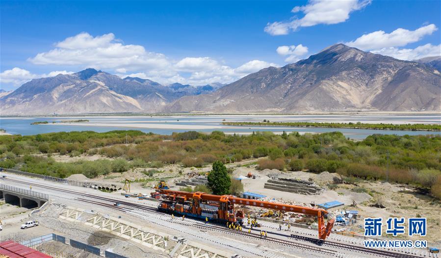6月6日,負(fù)責(zé)鋪軌的中鐵十一局集團(tuán)的建設(shè)者在現(xiàn)場(chǎng)作業(yè)。新華社記者普布扎西攝