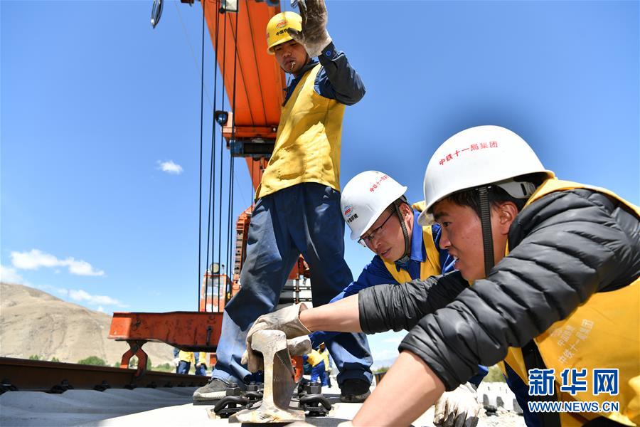 6月6日,負(fù)責(zé)鋪軌的中鐵十一局集團的建設(shè)者在現(xiàn)場作業(yè)。新華社記者李鑫攝