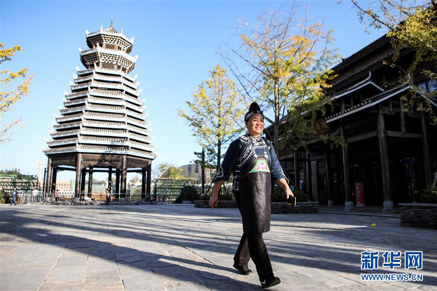 10月29日,楊芳從丹寨萬達(dá)小鎮(zhèn)內(nèi)的鼓樓前經(jīng)過。