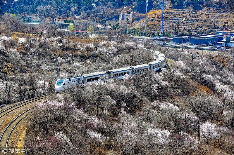 2019年3月22日,北京居庸關附近的山花盛開,S2線列車穿行在花海之中,構成一幅美麗的畫面。時永平/千龍圖像/視覺中國編輯/陳進