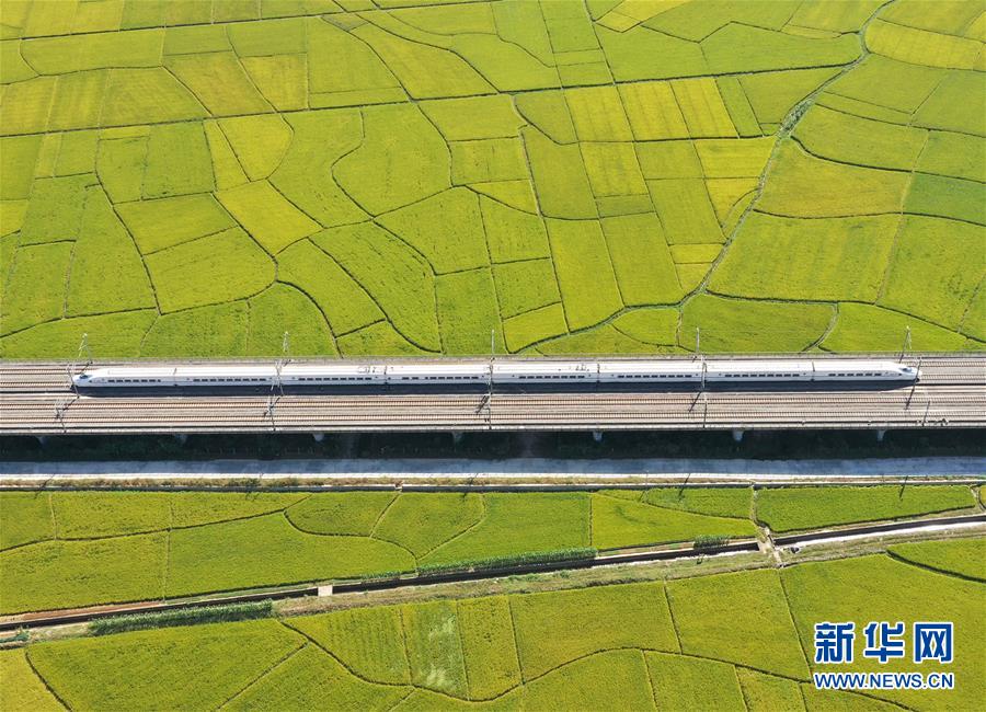 10月29日,列車從廣西賓陽縣古辣鎮(zhèn)豐收的稻田間駛過(無人機拍攝)。新華社記者陸波岸攝