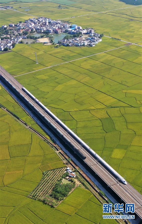 10月29日,列車從廣西賓陽(yáng)縣古辣鎮(zhèn)豐收的稻田間駛過(無人機(jī)拍攝)。新華社記者陸波岸攝