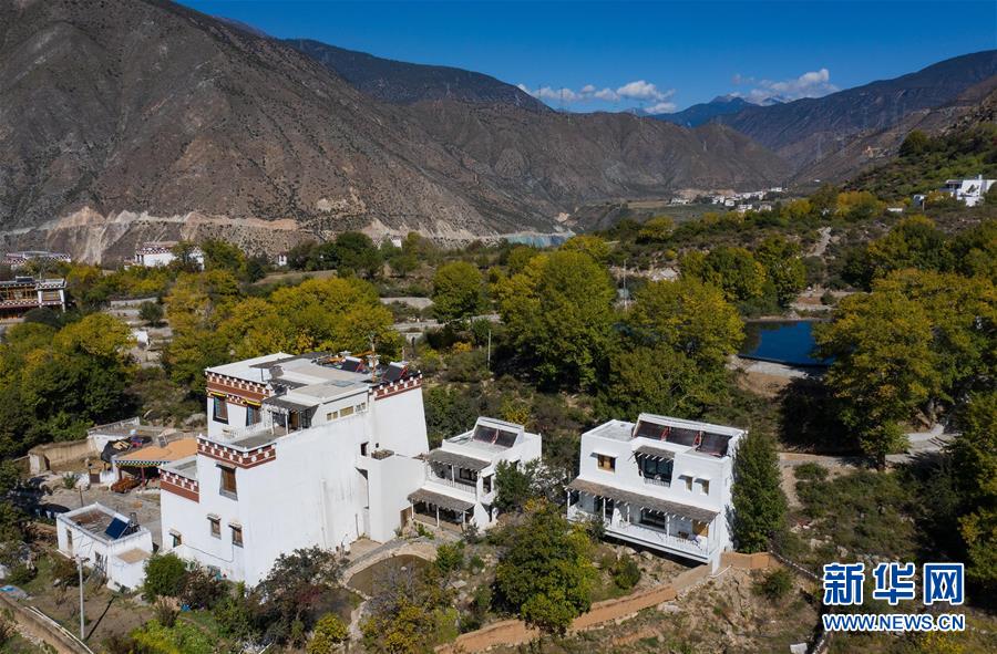 10月29日,四川省鄉(xiāng)城縣的定曲河峽谷的青德鄉(xiāng),民宿“皈院”保留了白藏房傳統(tǒng)民居特色(無人機(jī)拍攝)。新華社記者江宏景攝