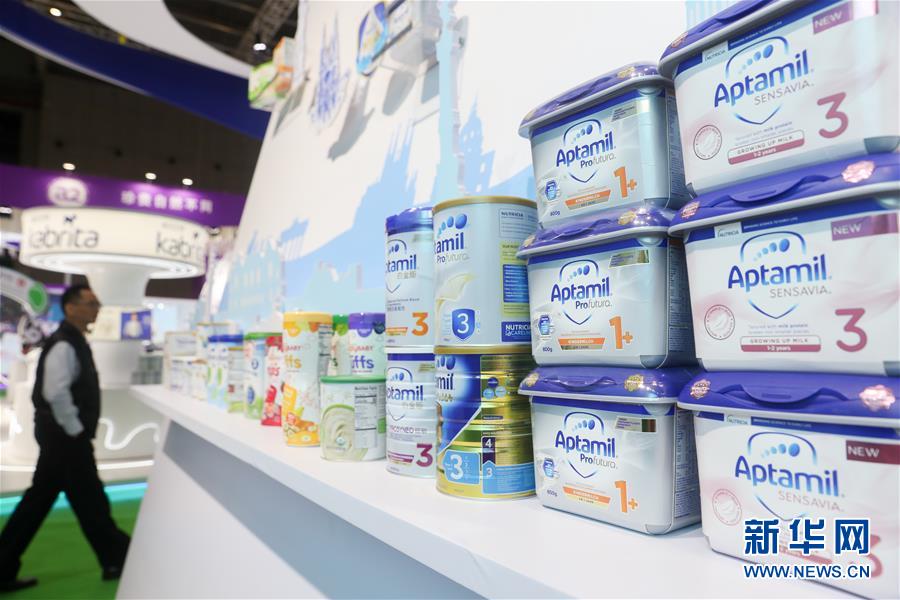 11月5日,在第二屆進博會食品及農(nóng)產(chǎn)品展區(qū),參觀者從達能展臺經(jīng)過。新華社記者丁汀攝