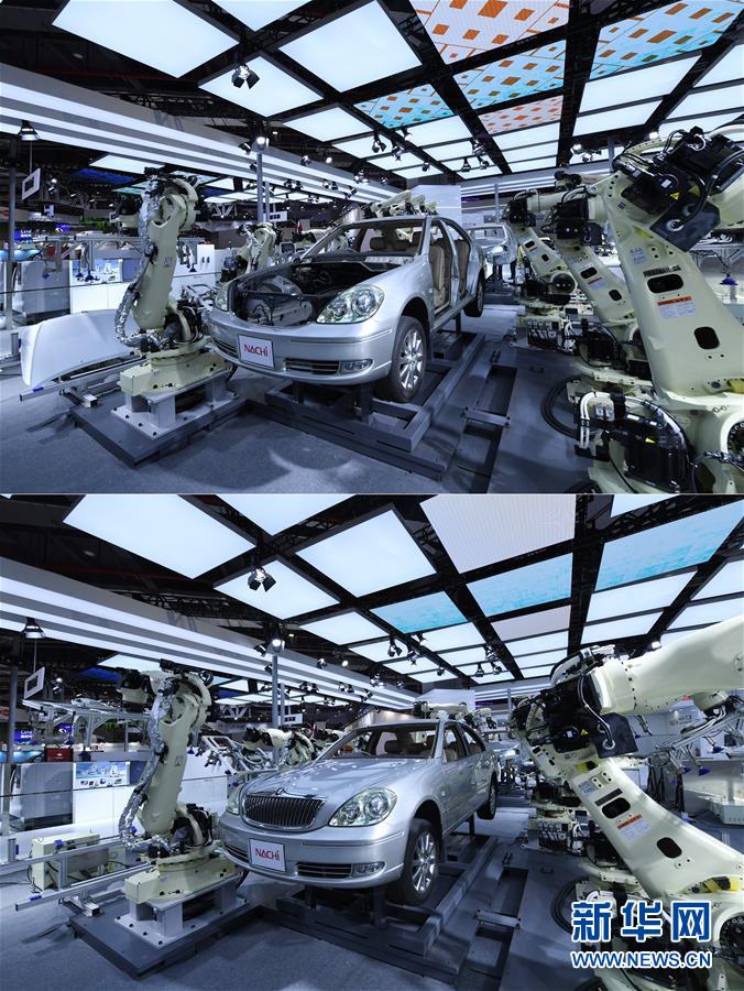 11月5日在第二屆進(jìn)博會裝備展區(qū)日本那智不二越公司展臺拍攝的拼版照片。上圖是NACHI超高速點(diǎn)焊SRA系列機(jī)器人操作前的汽車骨架;下圖為間隔一分鐘后拍攝的NACHI超高速點(diǎn)焊SRA系列機(jī)器人操作后的汽車外殼。新華社記者范培珅攝