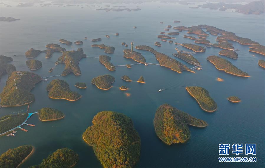 11月9日無人機(jī)拍攝的廬山西海。 當(dāng)日,落日余暉下的江西廬山西海山青水藍(lán),美不勝收。 新華社記者 周密 攝