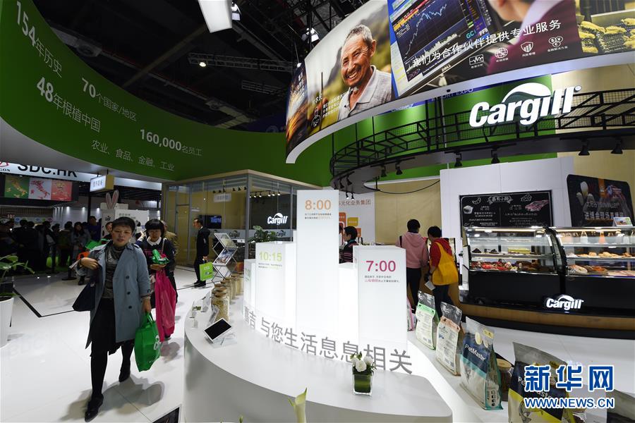 11月10日,在第二屆進(jìn)博會(huì)食品及農(nóng)產(chǎn)品展區(qū),參觀者在美國嘉吉公司展臺(tái)參觀。新華社記者范培珅攝