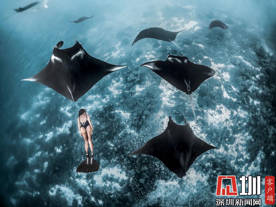 2019年7月2日?qǐng)?bào)道(具體拍攝時(shí)間不詳),印度尼西亞科莫多國(guó)家公園,美國(guó)自由潛水愛(ài)好者Kristina Zvaritch一次潛水時(shí),她的正下方恰巧游著幾只巨大的蝠鲼,這令人驚艷的一幕恰巧被她的丈夫拍下來(lái)了。當(dāng)她看到這些照片時(shí),自己都被驚呆了。晶瑩剔透的海水使這張照片有了視覺(jué)錯(cuò)位的效果,讓人以為Kristina與這些魚處于相同的高度,但實(shí)際上她離這些魚還有10-19英尺左右的距離。