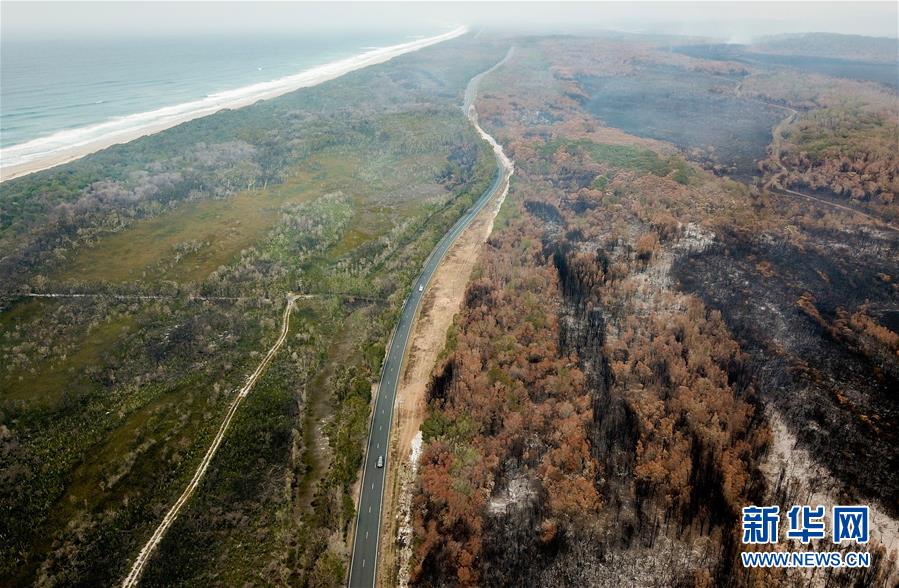 這是11月11日航拍的澳大利亞新南威爾士州麥夸里港附近的過火林地(右)。新華社記者白雪飛攝