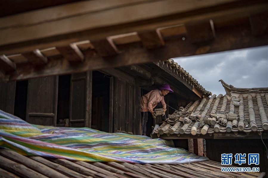 在石屏縣異龍鎮(zhèn)符家營(yíng)村211號(hào)民居,工人王艷華在修繕屋頂(8月8日攝)。新華社記者江文耀攝