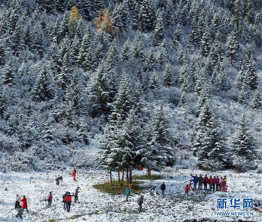 10月17日,在川藏線高爾寺山至理塘路段,部分游客在一個(gè)路邊觀景臺(tái)附近拍照留念。當(dāng)日,一場(chǎng)夜雪后,川藏線高爾寺山至理塘路段披上了一層銀裝。雪山、牦牛、云朵、松林,帶來(lái)了濃濃的雪域風(fēng)情。新華社記者王迪攝