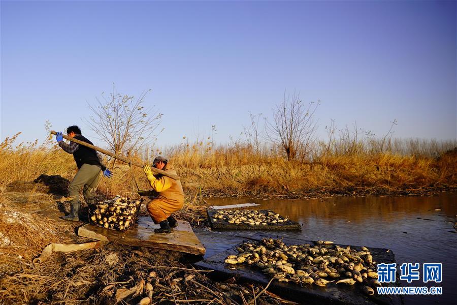 11月18日,工人在采收蓮藕。初冬時(shí)節(jié),河北省唐山市曹妃甸蓮藕豐收,工人們?cè)诮Y(jié)冰之前忙著采收蓮藕。新華社記者楊世堯攝