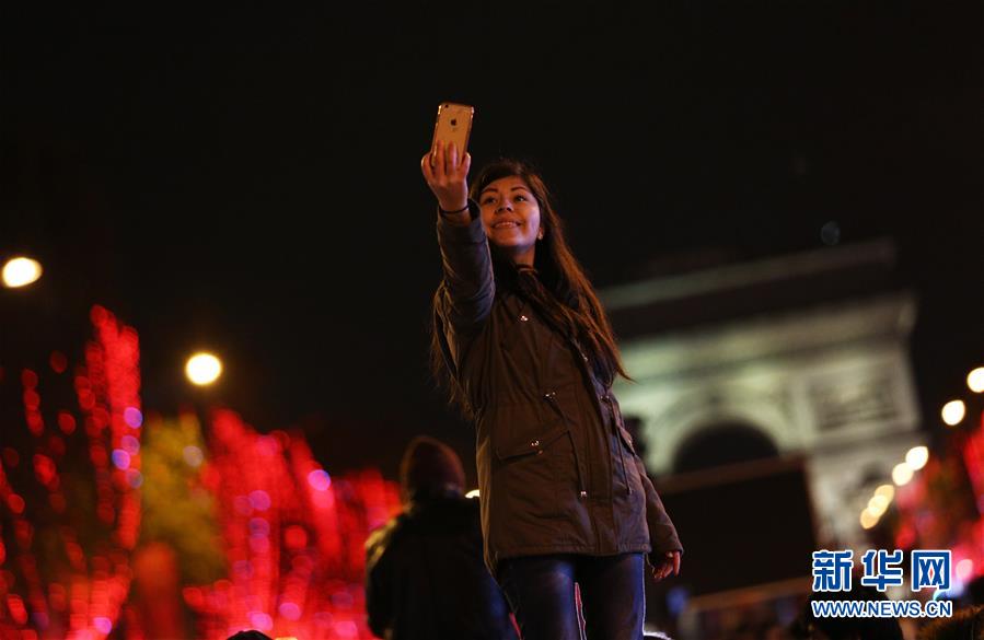 11月24日,在法國巴黎,一名女子在香榭麗舍大街點燈儀式上留影。當(dāng)日,法國巴黎香榭麗舍大街點亮彩燈迎圣誕。從即日起至1月8日,整條香榭麗舍大街都將被喜慶的節(jié)日燈飾點亮。新華社記者高靜攝