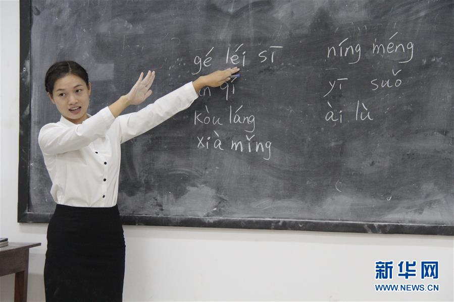 11月18日,在多哥首都洛美,中國(guó)老師文盼在第一堂中文課上講習(xí)拼音。新華社記者肖玖陽(yáng)攝