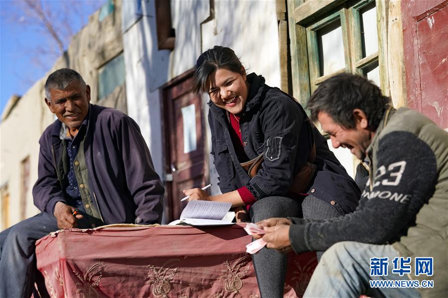 在地處塔克拉瑪干沙漠腹地的新疆于田縣達(dá)里雅布依鄉(xiāng),庫爾班罕·買提肉孜(中)與養(yǎng)羊合作社的合作伙伴結(jié)算購買羊肉的費(fèi)用(11月13日攝)。
