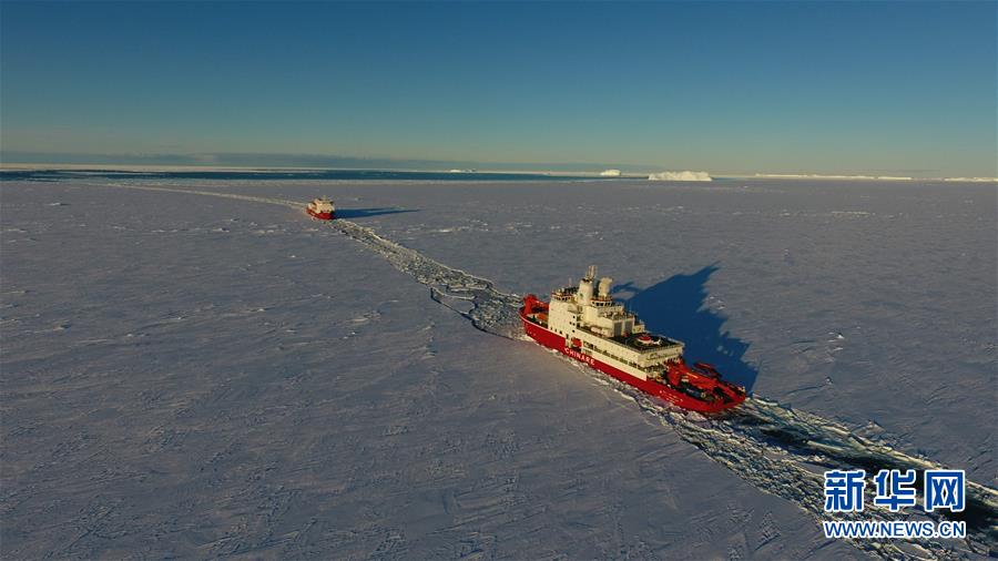 “雪龍”號與“雪龍2”號在新開辟的航道上(11月21日無人機(jī)拍攝)。