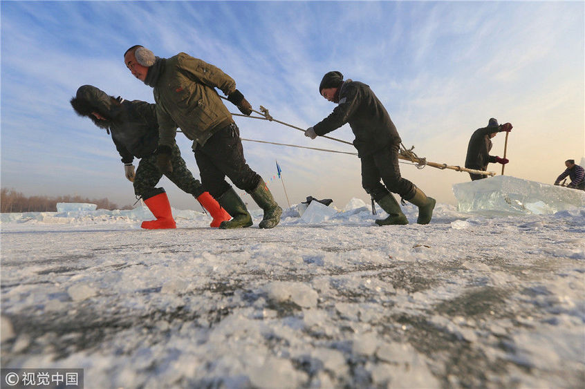2018年12月11日,黑龍江省哈爾濱市,松花江上,采冰者們彎腰拉繩,宛如纖夫般拽重達(dá)半噸的冰塊出水。采冰者都是自哈市江北萬寶、東發(fā)、沙陀子等鄉(xiāng)鎮(zhèn)的農(nóng)民,他們每年冬閑時(shí)都會(huì)親屬、村鄰之間結(jié)伴到松花江畔采冰,有的采冰人,已經(jīng)連續(xù)干了二十多年。每個(gè)采冰季,他們每天要在冰面上工作10-12個(gè)小時(shí),每個(gè)采冰組,一天要拽出冰塊2000-3000塊,一個(gè)近20天的采冰季,每人能收入近萬元。
