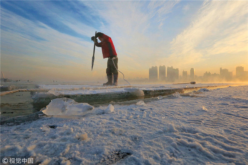 2018年12月11日,黑龍江省哈爾濱市,松花江上,采冰者們彎腰拉繩,宛如纖夫般拽重達(dá)半噸的冰塊出水。采冰者都是自哈市江北萬寶、東發(fā)、沙陀子等鄉(xiāng)鎮(zhèn)的農(nóng)民,他們每年冬閑時都會親屬、村鄰之間結(jié)伴到松花江畔采冰,有的采冰人,已經(jīng)連續(xù)干了二十多年。每個采冰季,他們每天要在冰面上工作10-12個小時,每個采冰組,一天要拽出冰塊2000-3000塊,一個近20天的采冰季,每人能收入近萬元。
