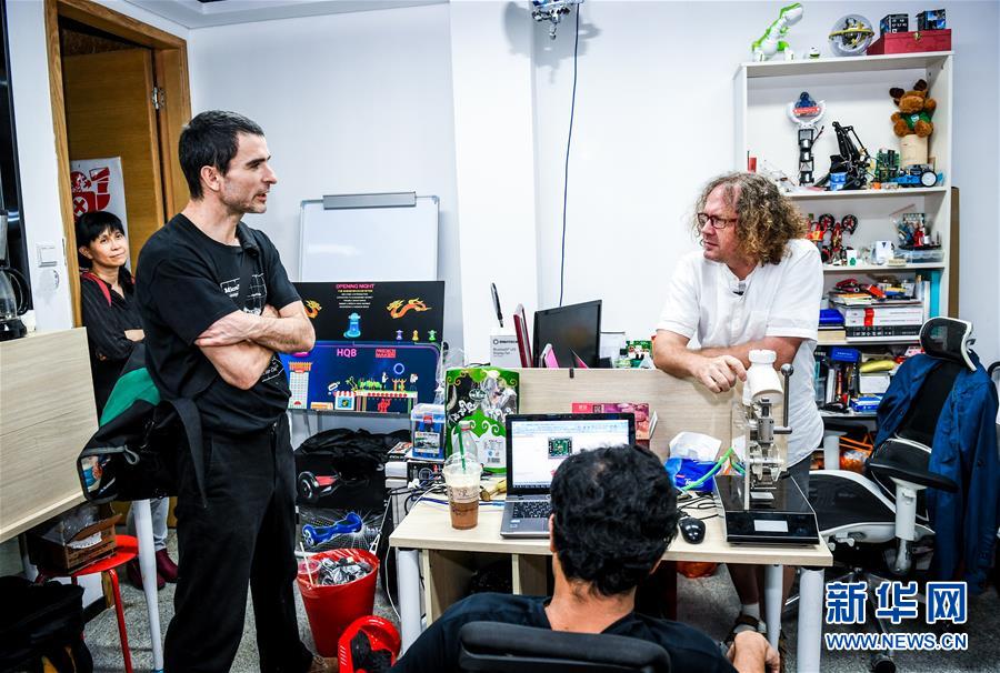 在深圳市福田區(qū)華強(qiáng)北一個創(chuàng)客孵化器內(nèi),來自荷蘭阿姆斯特丹的衛(wèi)國(右一)與來自不同國家的創(chuàng)客交流(2018年10月25日攝)。 新華社記者 毛思倩 攝