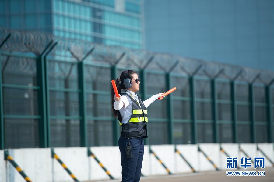 11月25日,澳門國際機(jī)場營運員鄧祺君在機(jī)場指揮飛機(jī)停泊,她已經(jīng)工作了3年。 新華社記者 張金加 攝